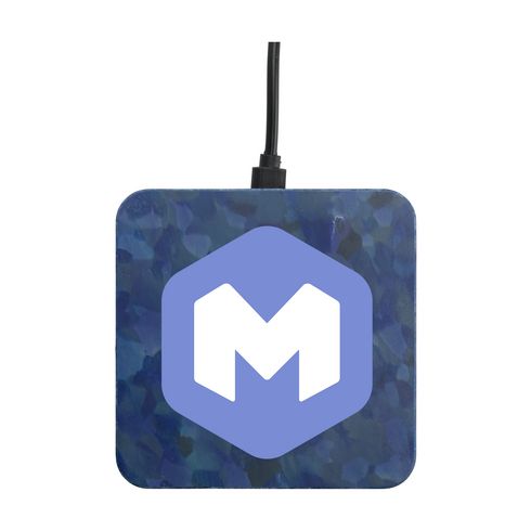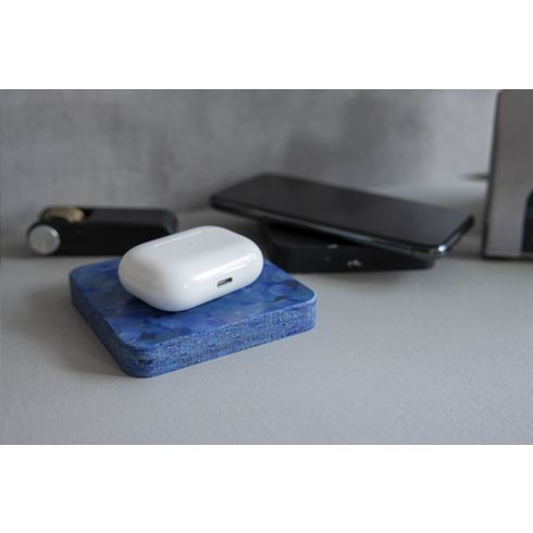 This wireless phone charger is made from old blue printer coils. Plastic is cleaned, chopped and then shaped into plates and presses. The docks are ground from these plates.