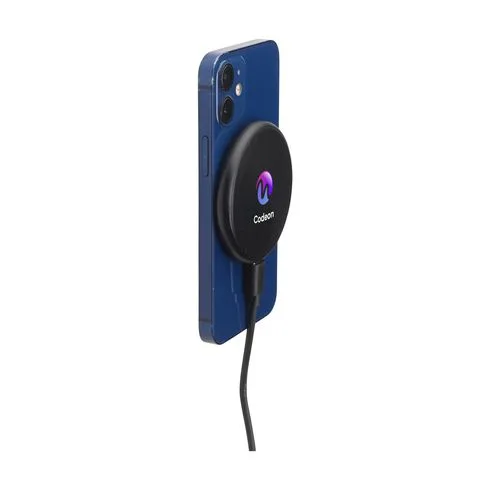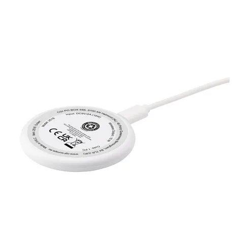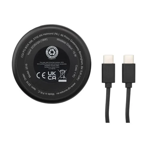 Magnetski bežični 15W punjač s kućištem od recikliranog ABS-a. Lako se pričvrsti na stražnju stranu mobitela pomoću integriranih magneta za optimalno punjenje. Pogodan za punjenje slušalica, iWatcha i mobitela. Ulaz: Type-C DC9V 2A. Izlaz: 15W. Uključuje Type-C/USB-C kabel i priručnik. RCS-certificiran, 21 % recikliranog materijala.