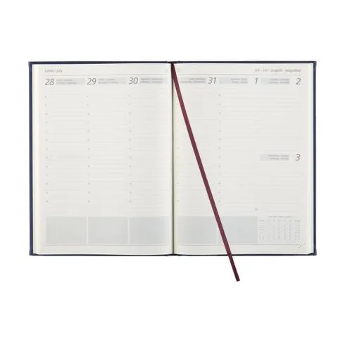 Uredski rokovnik na četiri jezika: EN, NL, FR i DE. S izdržljivim, podstavljenim Balacron koricama i utisnutom godinom na prednjoj strani. Krem papir bez drvnih vlakana, 80 g, FSC Mix certificiran, tiskan u dvije boje, uvezan koncem. Veliki tjedni pregled na dvije stranice, godišnji planeri za tekuću i sljedeću godinu te dodatne korisne informacije.